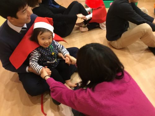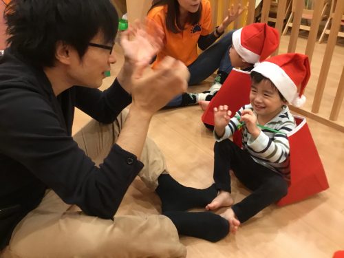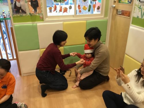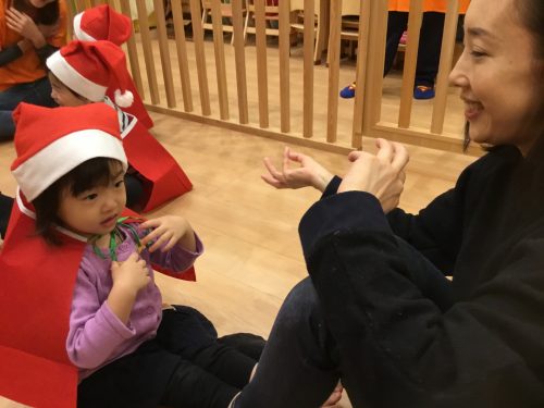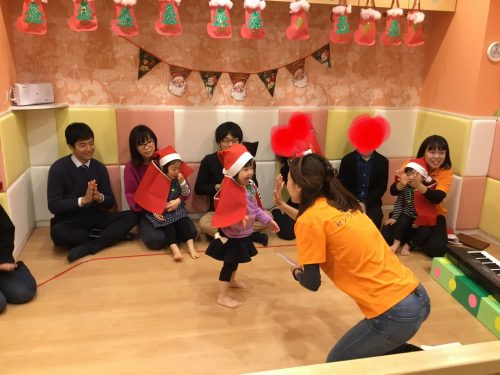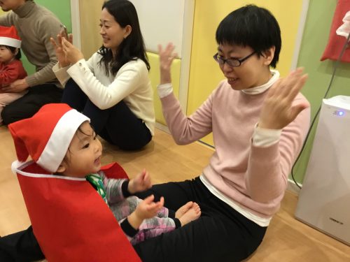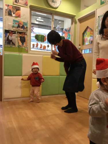 うさぎのはらの?クリスマスのお歌を、うさぎさんのお耳のように、小さな可愛らしいおててを一生懸命伸ばしたり、腰に手を置き“フリフリ”とリズムをとり元気に歌う姿を見て