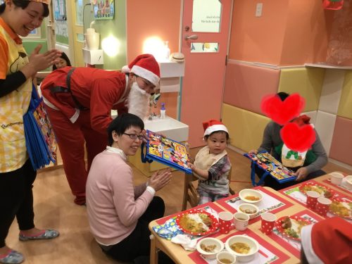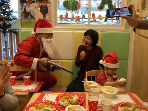 保護者の皆様にも一緒にお給食の一番人気カレ-を食べて頂きました。皆様「美味しい~」と言っていただきお代わりもして頂きました。そんな時どこからか “シャンシャンシャン”と鈴の音が!サンタさん登場です!「わ-い!」とお子様も、大人もとても嬉しくなりました。やっぱりサンタさんて夢があっていいですね~![]()