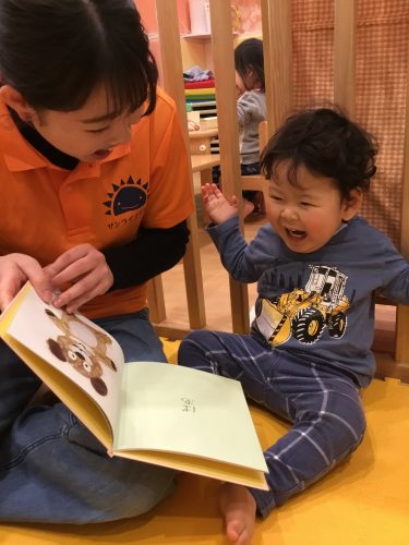 お姉さんの読み聞かせの声に合わせて、、「いないいなーい『ばぁー!』」