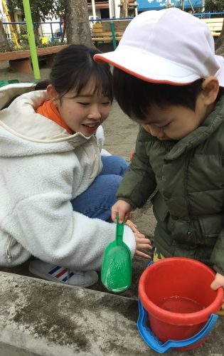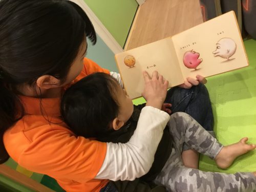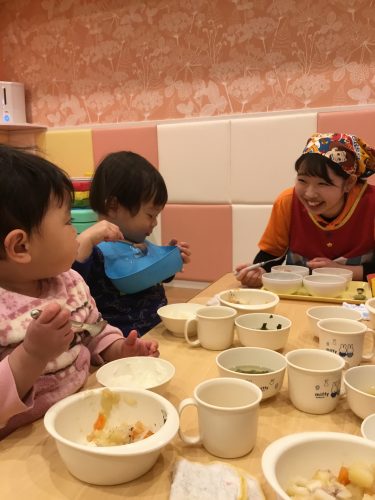 」と渡す1歳児さん、「〇〇行ったことあるよ!」「〇〇知ってるよ!」と一生懸命お話する2歳児さんに優しく「うん、うん」とお話を聞いてくれるお姉さん![]()