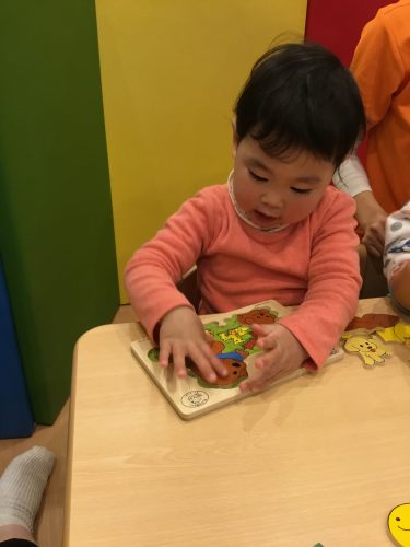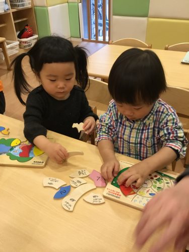 難しい時は保育士に「これは?」と尋ねて手伝ってもらったり、何度も繰り返すことで『このピースはここ!』と覚えていっているところです![]()