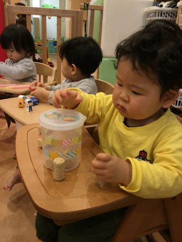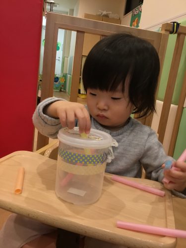 また、コルクやストローを全部落としたあとには、もう一度やろうとして「(蓋を)あけて」と保育士に伝える姿も見られました![]()