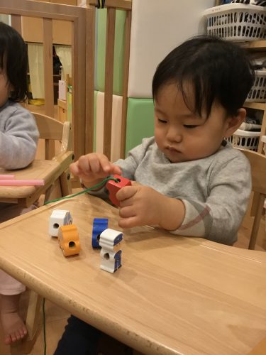 さて、りんご組さんが練習をしている間・・・いちご組さん、もも組さんは隣のお部屋でパズルや紐通しなど指先を使う玩具に挑戦しています![]()