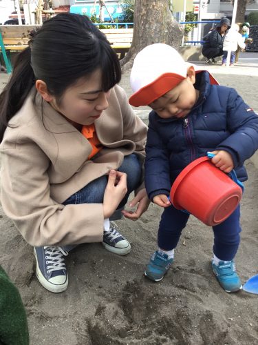 公園では「見て見て!」と言うように自分からおもちゃを持って近づいていく0歳児さんや、砂場で作ったおままごとのご飯をお姉さんに「どうぞ