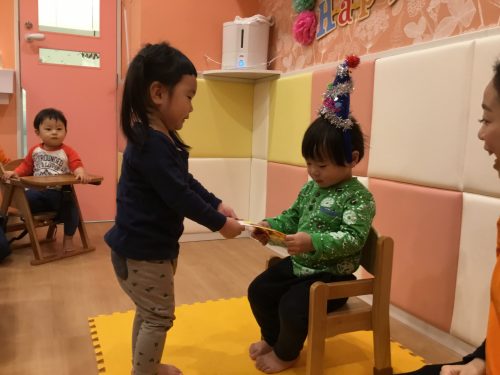みんなに「ハッピ-バースデー」のお歌を歌ってもらい、いちご組のお友だちから、お誕生日カ-ドとプレゼント