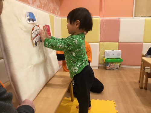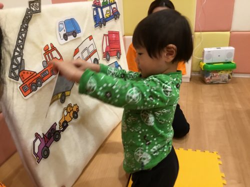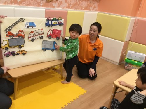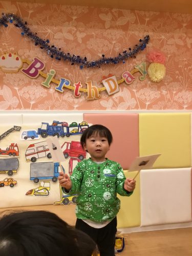 」のお声があり、もう一度!今度は職員ではなく、お誕生日のお友だちが色々な車のパネルを手に持ち”ぺたり”と真剣な表情も見られましたしまた嬉しそうな表情も見ることができました