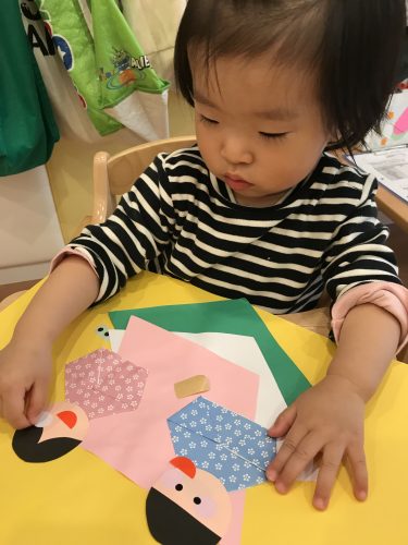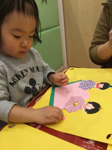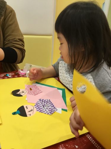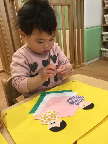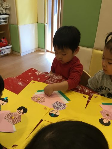 1歳児クラスのいちご組さんは、「お雛様は女の子!!」とお話しながら、真剣な表情をしながらキラキラの扇や冠を糊で貼ったり、