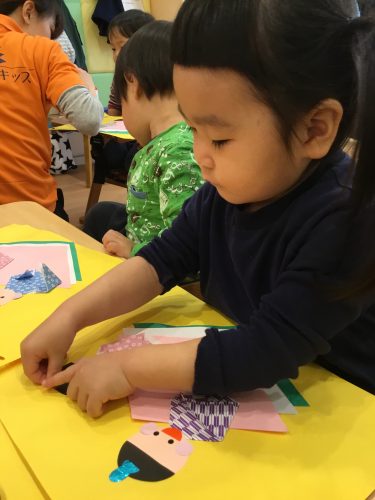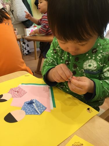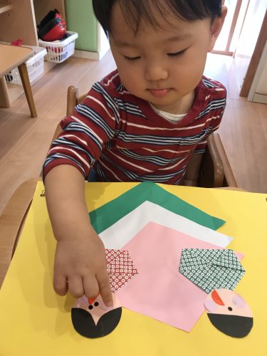 2歳児クラスのりんご組さんは、好きな色の千代紙を選び、保育者の話を聞きながら着物をおりました♪