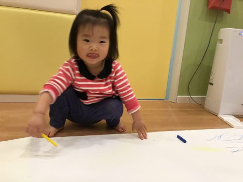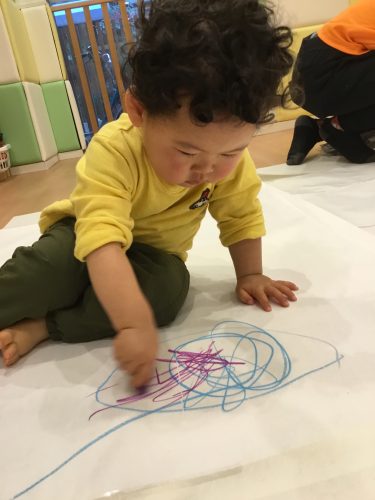 ある日の夕方保育では保育室いっぱいに大きな紙を広げ、表現遊びを楽しみまし♪