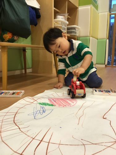 保育者が線路を描くと乗り物の玩具を持ってきて、「カンカンカン!」と言いながら、走らせて遊ぶ姿が見られましたよ♪