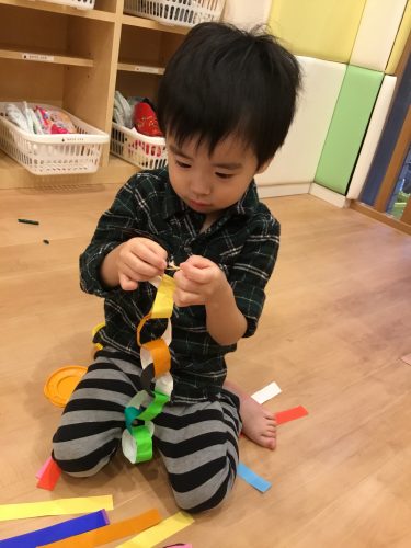 糊付けをしながら、折り紙同士を繋げて、輪つなぎを作るお子様![]()