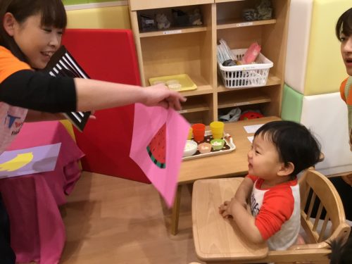 をして女の子のお祭りをお祝いしました。おまけに「ク~イズ!クイズなあ-んのクイズ」に合わせて黒いシルエットと保育者のヒントから何の果物かを考えるクイズに挑戦してみました