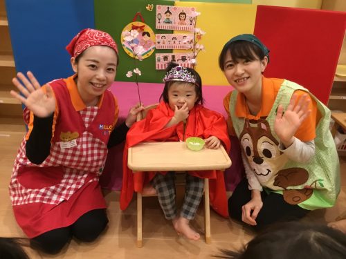 「黄色くて長くて、甘-いにおいのする果物で、お給食にも出るみんなの大好きな果物な~んだ?」と聞くと。すぐに「バナナ!!!」と元気なお声を聴くことができました。「ク~イズクイズ、、」に興味津々のお子様達はこの後何度も果物の名前を言いながら楽しんでくれる姿がとても印象的でした。とても素敵なおひな祭り会になりました。これからも元気いっぱいで笑顔の素敵な女の子になってくださいね![]()