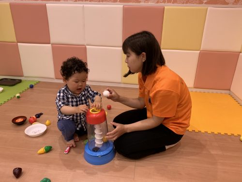 いちご組さんの男の子は実習生のお姉さんに「僕の好きなおもちゃ。こうやって遊ぶの。楽しいでしょ