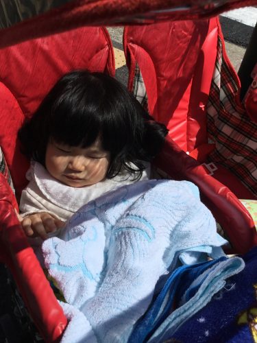 お日様ポカポカで気持ち良さそうですね。夢の中でお散歩の続きをしているのかなぁ?