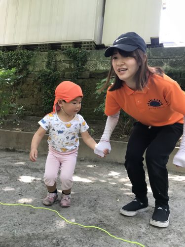 保育者にお名前を呼ばれたお子様から「はーい!」とお返事をして、縄跳びの側にやってきて、、、