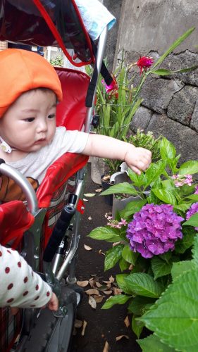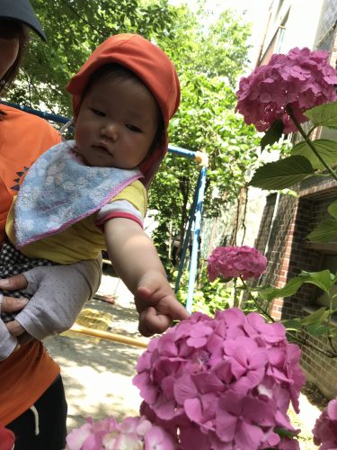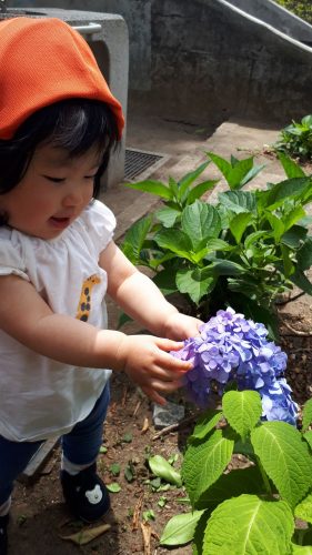 小さなお友達にとって、色鮮やかなあじさいは一際目を惹くようで、