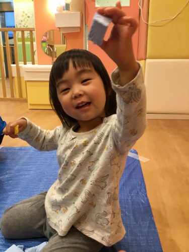 保育室にブルーシートを敷く様子を見て「わぁ!海みたいだねー!」と
