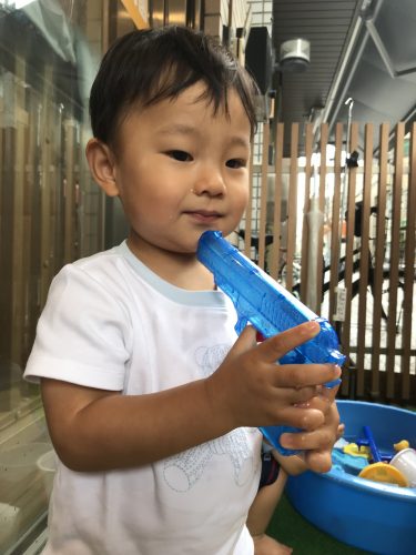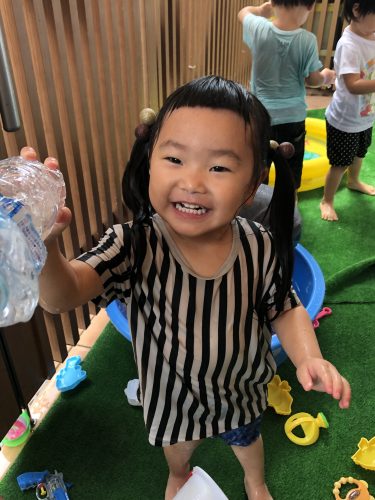 いちご組さんは水鉄砲が打てるようになり、「ばちゃばちゃ♬」と言いながら狙ったところに当てようと楽しんだり、もも組さんは水しぶきや音が楽しいようで声をあげて笑いながら、水面を叩いて遊ぶ姿が見られました![]()
