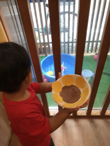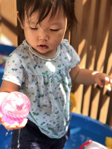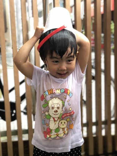 外で水遊びするお友達に「見て〜!作ったの〜!」と見せに行く姿も…?