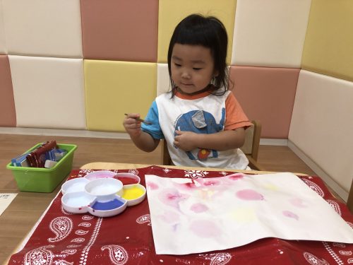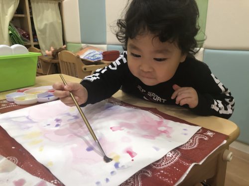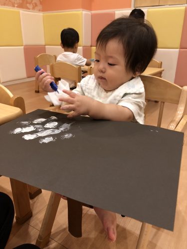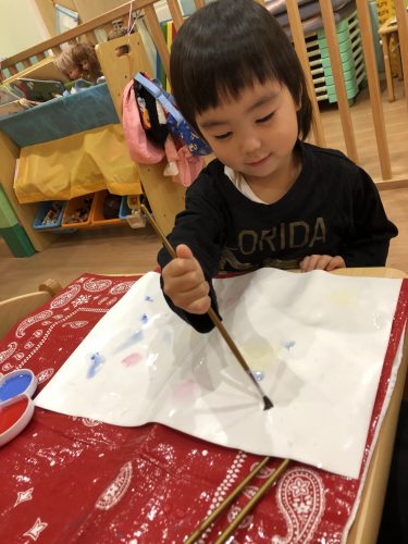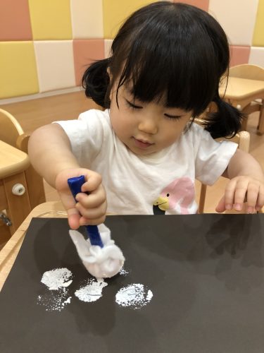 いつもと違う絵の具の広がりが不思議なようで「みてみて!」とたくさん保育者とお話をしながら製作を楽しんでくれました![]()