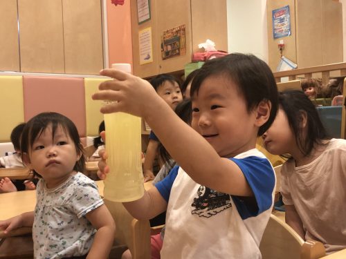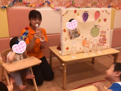 透明なお水が入ったペットボトルに保育者と誕生児さんが「ちちんぷいぷい!」と魔法をかけて、ペットボトルを振るとなんとメロンジュースやオレンジジュースが…![]()