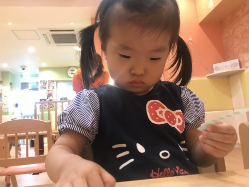いちご組のお友達は 限られた台紙の中に小さなシールをペタペタ…