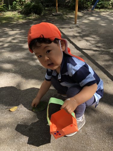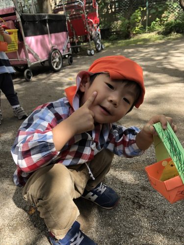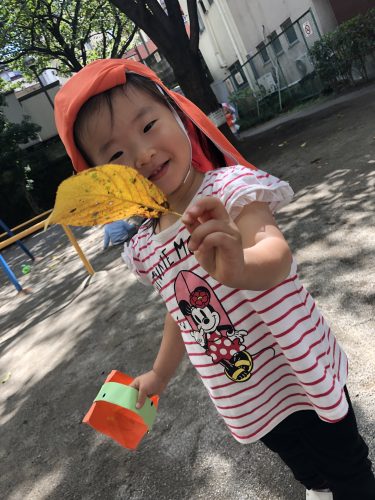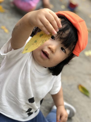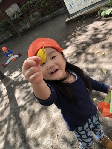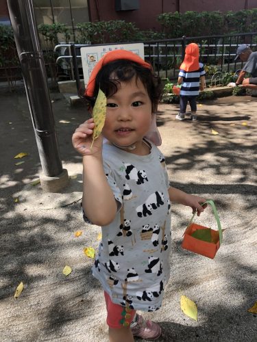 丸山福山公園にはたくさんの落ち葉があり、黄色や赤色に色付いた落ち葉を見つけて嬉しそうに「柿箱」の中に入れて持ち歩く姿に「秋ならでは」の遊びを感じる事ができました。持ち帰った色とりどりの落ち葉は来週の製作に使います。落ち葉がどんな作品になるのかとても楽しみです
