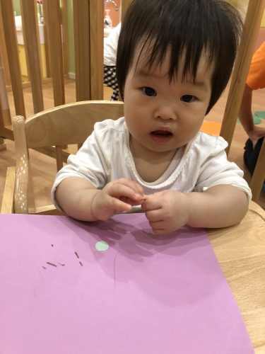 0歳児クラスのもも組さんは、シ-ル貼りで可愛らしく装飾をしてくれました。●シ-ルを保育者に渡してもらいペタリ!と自分の好きなようにペタペタ1辺に集中的に貼ってくれるところもまた可愛らしいもも組さんのお友だちでした