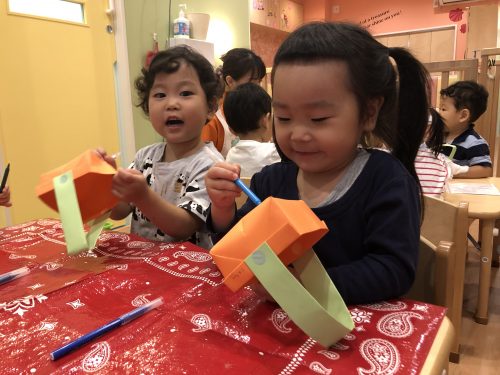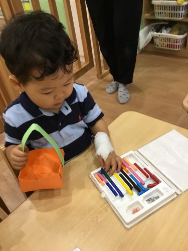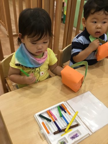 2歳児クラスのりんご組さんはサインペンでの装飾に挑戦です。