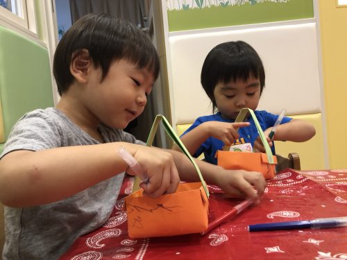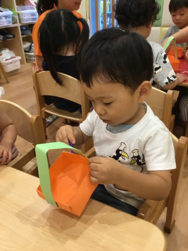 今週の活動として保育者がオレンジ色と黄緑色の色画用紙で「柿」の形をした「柿箱」を用意しました。