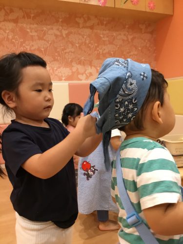 りんご組さんのお姉さんが1歳児クラスのいちご組さんに三角巾を結んであげようとしている、と~ってもほのぼのと温かい気持ちになる一場面です「○○ちゃんがやってあげるよ~