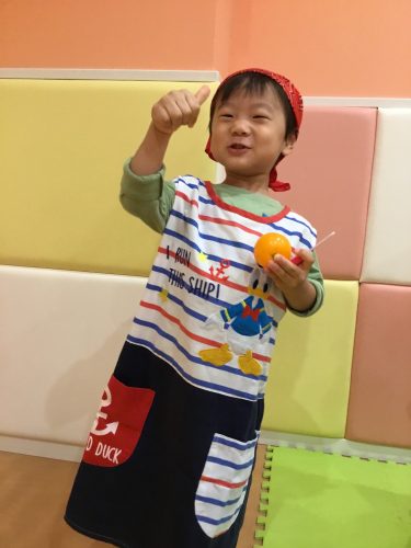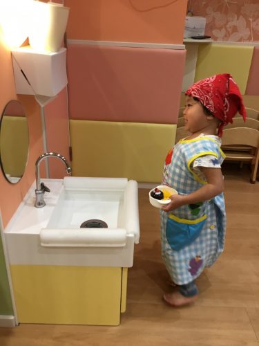 憧れの2歳児クラスのお兄さんお姉さんの楽しんでいる姿を見て「真似っこ!」をする1歳児クラスの可愛いお友達。エプロンをつけて「お母さんごっこ」の始まりです。異年齢の関りは子供たちの成長に欠かせないものと思います。そして、「ごっこ遊び」は想像力を育み、脳の発達にも効果的といわれています。先ほどの「お母さんごっこ」では、お家でのお母さんの様子を観察、記憶しながら自分も「お母さん役」になるという『記憶力』、お家でのお母さんの言っている言葉や仕草の真似をする『表現力』自分の頭の中でお話を作り上げる『想像力』お友だちとの関わりや言葉でのやりとりをする『コミニケ-ション』とその他、様々な効果があると思います。保育者も一緒に楽しむ事でさらに遊びが広がり楽しさを共有する事ができるので私も「ごっこ遊び」が大好きです。その可愛らしい姿がこちらになります