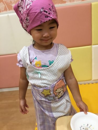 2歳児クラスのりんご組さんの女の子が「「○○ちゃんのママもエプロンするよ~」と言いながらテ-ブルの上にお皿を並べて美味しそうなご飯をごちそうしてくれました。保育者が「○○ちゃんもママみたいにエプロンしてみる」と聞くと「したいしたい!エプロンする」とにっこり。周りのお友だちもエプロンと三角巾をつけて「ママに変身」」男の子も女の子も大好きなママに変身できたことが嬉しくて保育室の中は、とても賑やかな楽しい雰囲気に。