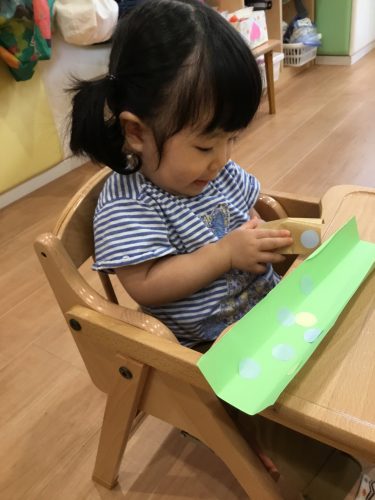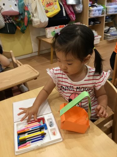 「どれがいいかな~迷っちゃうな~」と真剣な表情や「○○ちゃん緑がいい!」と、すぐに手に取るお友だちと様々でした。「サインペンのキャップが迷子になって悲しいのでペンの後ろにつけましょう。」「使い終わったら元の場所に戻しましょう」とこの日は2つのお約束をしてみました。すると早速お子様達は「迷子になったらかわいそうだもんね~」と言いながら保育者の伝えたとおりにりんご組さん全員ペンのキャップをペンの後ろにつける様子を見て大変、嬉しく思いました。様々なことを経験の中から理解する事ができる様になってきた2歳児さんには、私たち保育者は、ゆっくりと丁寧に分かりやすい表現で伝えていくことで「なんで」「どうして」→「分かった」と少しずつ段階を踏んでいくことで「理解」できたことを嬉しく思えるようになってきます。その繰り返しが今後の自信にもつながると思います