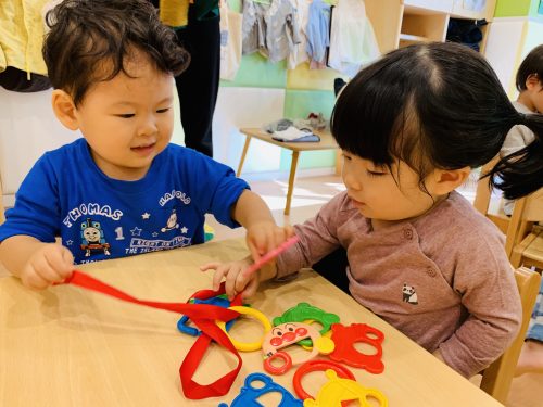 ここを持って、引っ張って…手先に集中する可愛いいちご組さんのお友だちです。
