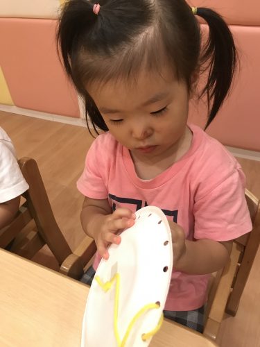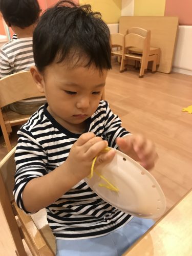 いちご組さんも保育者にゆっくり教えてもらいながら紐通しを楽しみました![]()