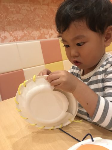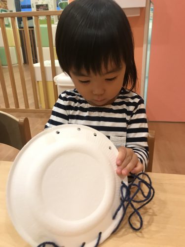 紙皿の淵に穴を開けたところに紐通しをしてみました![]()