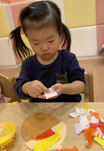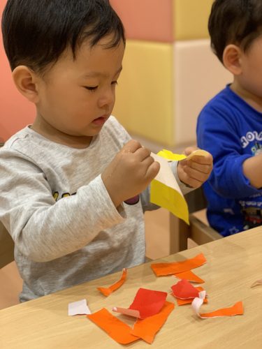 いちご組?さんは、「どんぐりころちゃん」の帽子に折り紙をちぎり貼りしました?