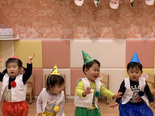 「赤!青!黄色!緑!」と大きなお声で歌いながらお遊戯も保育者と一緒に楽しんでくれました。その時の笑顔が又たまらなく可愛らしいのと大きな成長した姿に感激です![]()