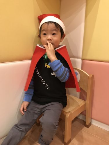 赤いケ-プにサンタさんの帽子を被り毎年恒例になっていますこの時期ならではの
