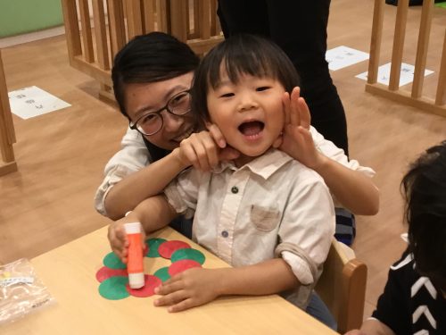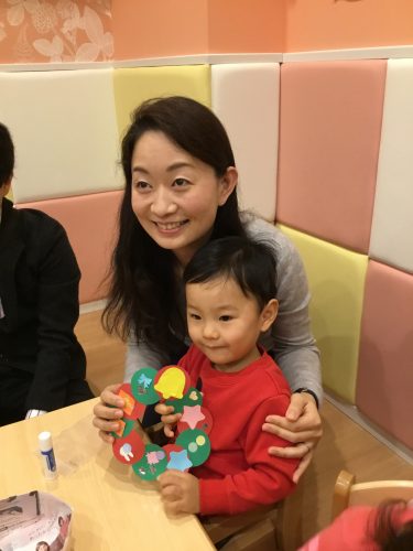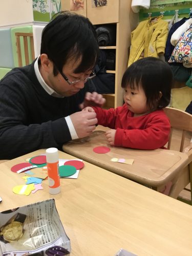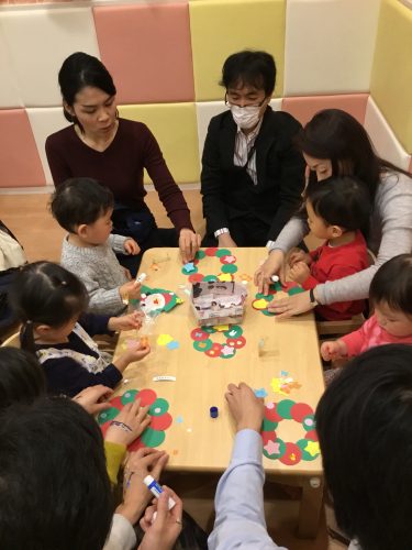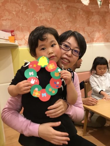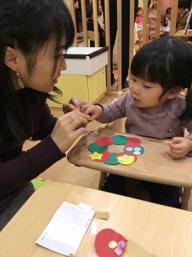 最後は大好きなお父さんお母さんと一緒に?クリスマスのリ-ス製作に挑戦です?丸い色画用紙とオ-ナメントを糊で好きなようにペタペタ。