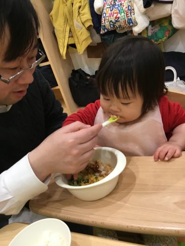 体操も楽しんでお腹はペコペコ~ お給食の時間も大好きなお父さんお母さんと一緒で嬉しい~![]()