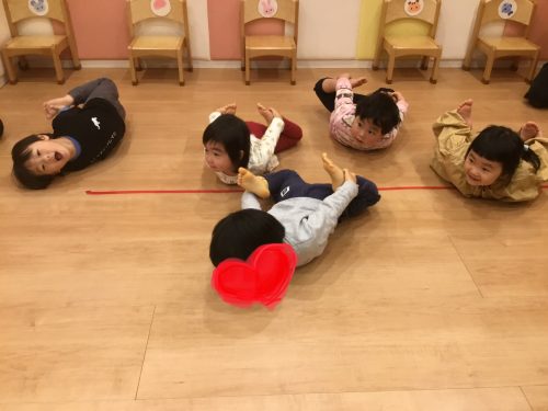 」と沢山の拍手。その後は「もしもし亀よ亀さんよ~」のお歌に合わせて腹ばいになり両手で両足を持つ難易度高いリトミックにも挑戦してみました。頬をほんのり赤くしながら頑張りました![]()