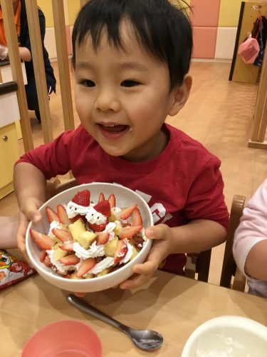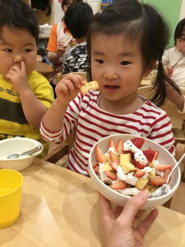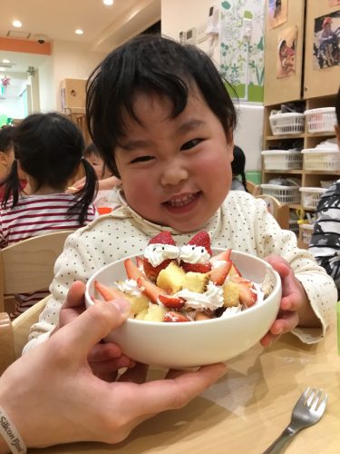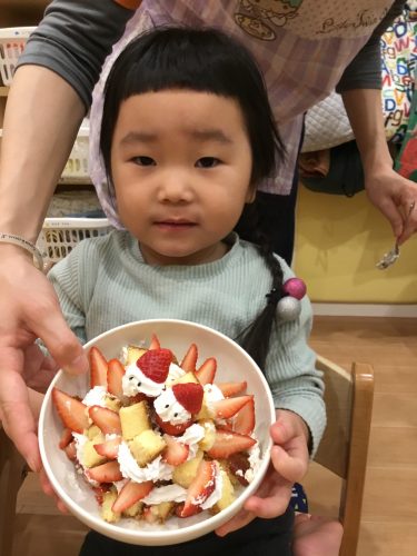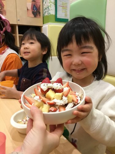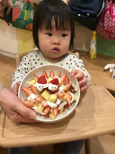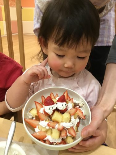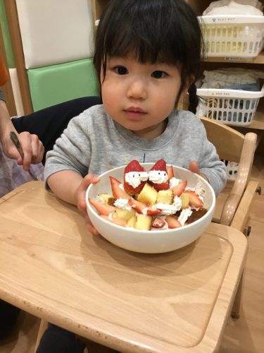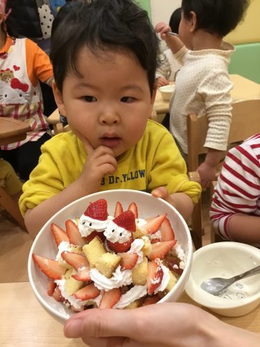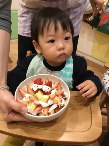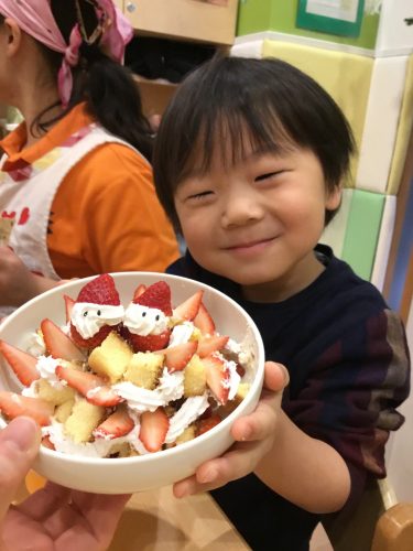 口の周りにクリームをつけて、「サンタさんのおひげみた〜い!??」とニコニコでクリスマス会の余韻を楽しむお子様たちでした?