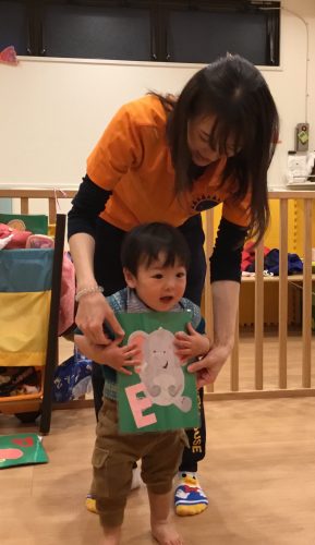 0歳児さんの可愛いもも組さんはお兄さんお姉さんの英語活動にも興味深々です