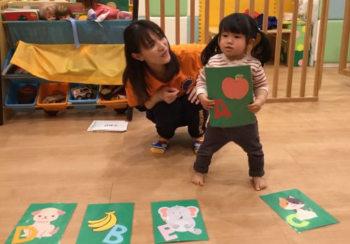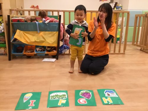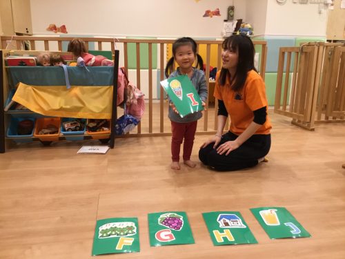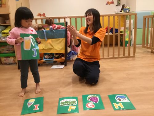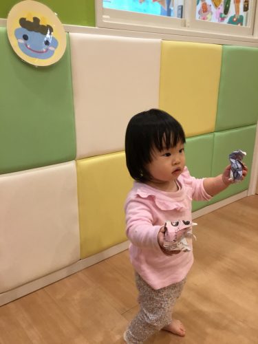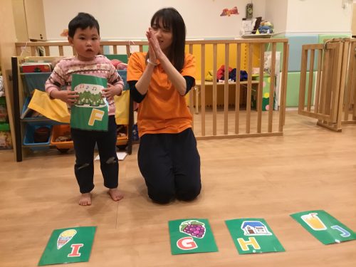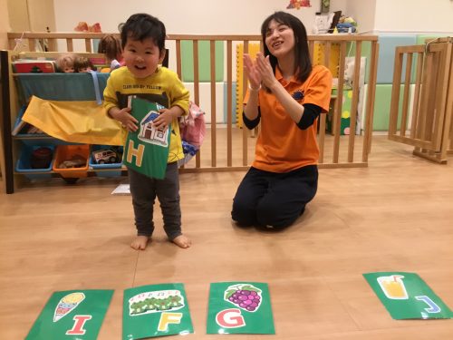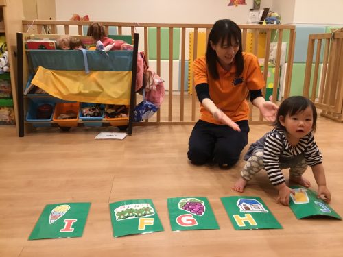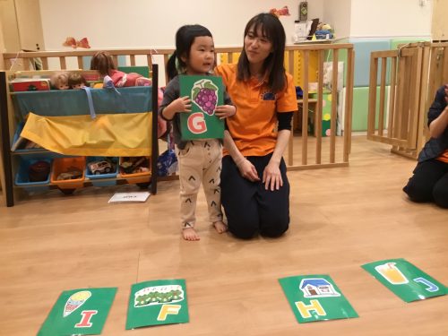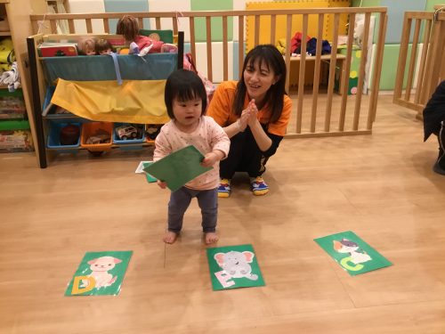 保育者が「Can you pick a 〇〇 card❓」と2歳児さんと1歳児さんに質問をすると嬉しそうにカードを探しに行き