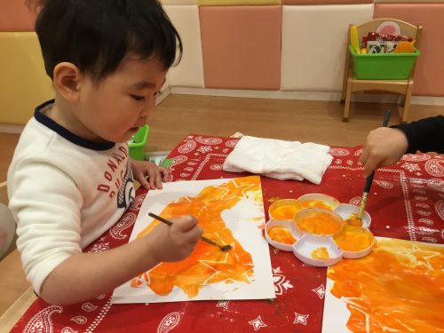 白い画用紙に白いクレヨンで絵を描き、その上から好きな色の絵の具を塗ると「ワア一なんか出てきたなになに」と不思議そうに、はじき絵に挑戦!
