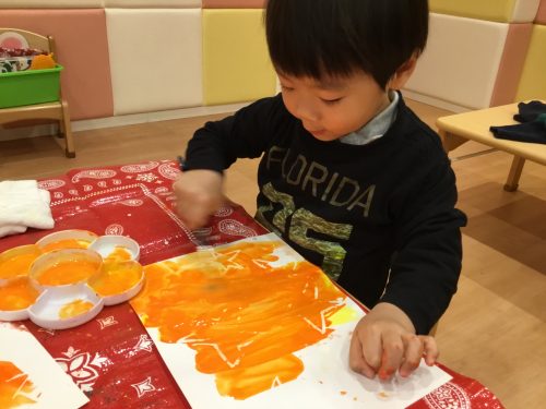 今週は雨が降ったり、気温が低い日もありましたが室内で体操発表会ごっこやリトミックで体を十分動かし満足げなお顔も見せてくれました。組さんのお友だちは絵の具遊びも楽しみました。