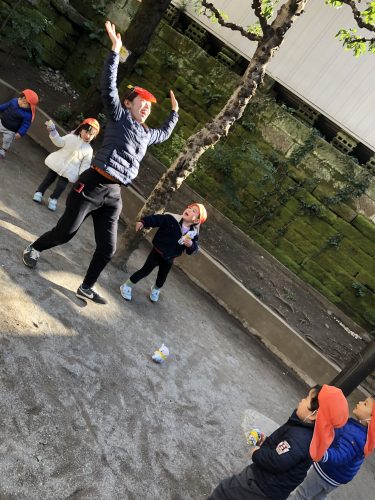 節分会の後のお散歩にも新聞豆を持っていき、保育者に向かって「鬼はそと!福はうち!」と余韻を楽しみながら投げて遊ぶことができました